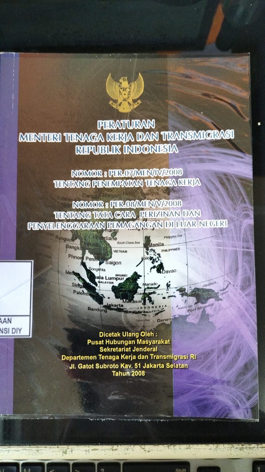 | Abstract/Notes | PERATURAN MENTERI TENAGA KERJA DAN TRANSMIGRASI REPUBLIK INDONESIA NOMOR: PER.07/MEN/IV/2008 TENTANG PENEMPATAN TENAGA KERJA NOMOR: PER-08/MEN/V/2008 TENTANG TATA CARA PERIZINAN DAN PENYELENGGARAAN PEMAGANGAN DI LUAR NEGERI Dicetak Ulang Oleh: Pusat Hubungan Masyarakat Sekretariat Jenderal Departemen Tenaga Kerja dan Transmigrasi RI JI. Gatot Subroto Kav. 51 Jakarta Selatan Tahun 2008 |